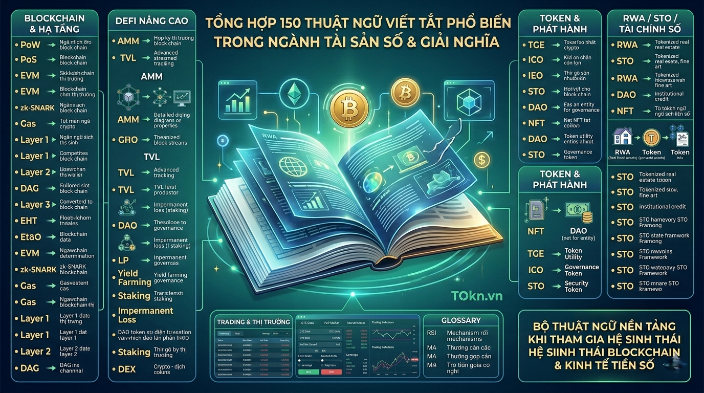 Thị trường tài sản số phát triển nhanh kéo theo hàng loạt thuật ngữ viết tắt như STO, RWA, DeFi, DAO hay TVL được sử dụng phổ biến trong giao dịch và phân tích. Việc hiểu đúng các khái niệm này giúp nhà đầu tư nắm bắt cấu trúc thị trường, cơ chế vận hành và đánh giá dự án hiệu quả hơn. Danh sách dưới đây tổng hợp 50 từ viết tắt quan trọng nhất trong ngành tiền số, bao gồm nhóm tài chính phi tập trung, giao dịch thị trường, token hóa tài sản thực và hạ tầng blockchain