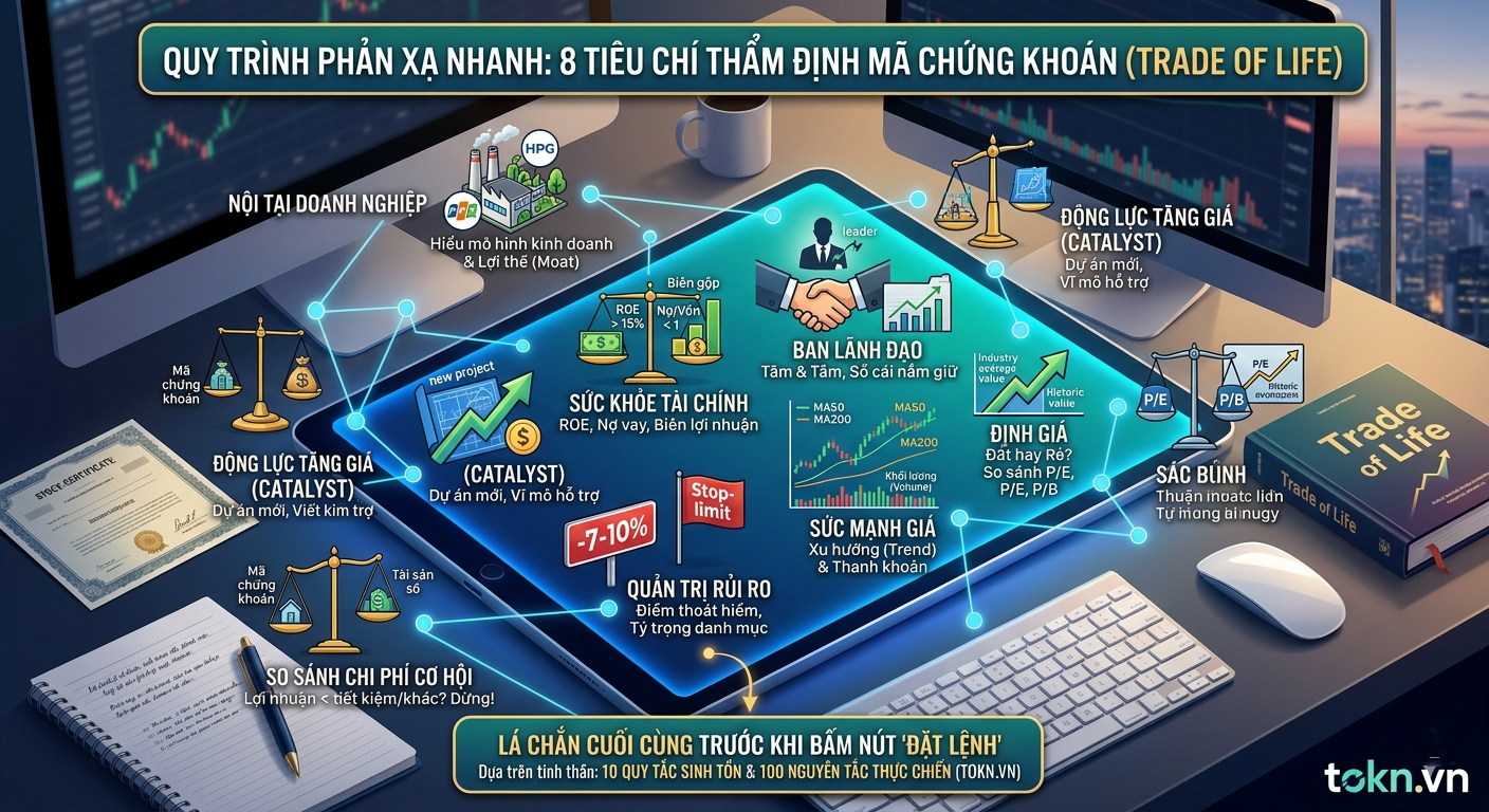 Bộ Checklist 8 tiêu chí thẩm định nhanh dưới đây chính là cách tôi cụ thể hóa 'Trade of Life' vào thực tế. Nó giúp bạn loại bỏ cảm xúc, bỏ qua những lời hô hào 'phím hàng' trên các hội nhóm để tập trung vào những con số thực và giá trị thực của doanh nghiệp. Hãy dùng nó như một lớp lá chắn cuối cùng trước khi bạn bấm nút 'Đặt lệnh'."