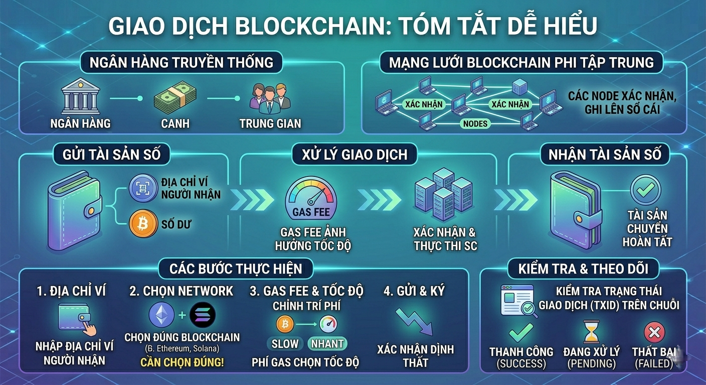 Giao dịch trên blockchain là quá trình chuyển tài sản số từ địa chỉ ví này sang địa chỉ ví khác thông qua mạng lưới phi tập trung. Không giống chuyển khoản ngân hàng truyền thống, giao dịch blockchain không cần trung gian mà được xác nhận bởi các node trong mạng. Khi thực hiện giao dịch, người dùng cần hiểu cách gửi nhận tiền điện tử, phí gas và quy trình xác nhận giao dịch.
