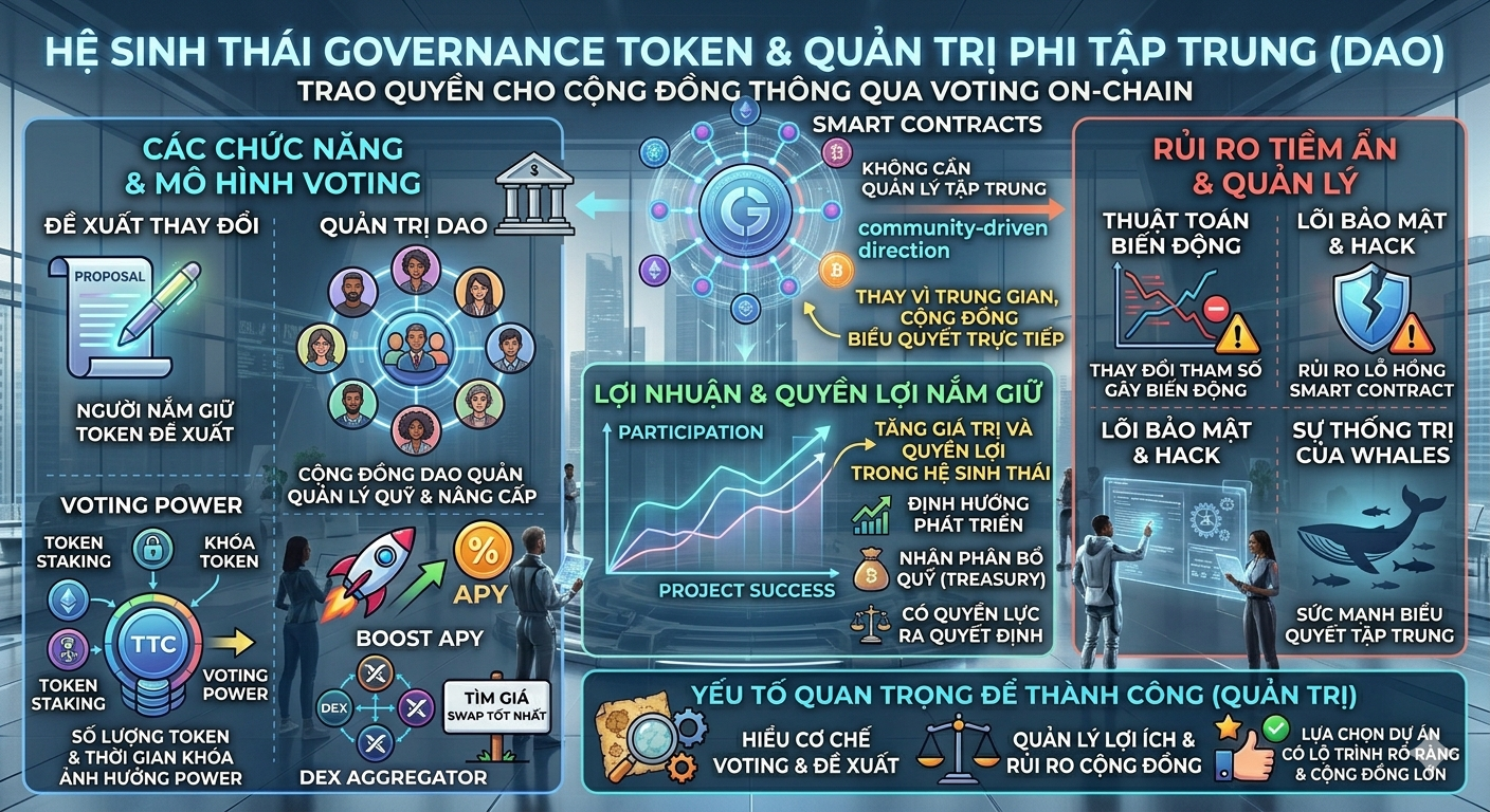 Token quản trị (Governance Token) là loại token cho phép người nắm giữ tham gia biểu quyết và quản trị dự án blockchain hoặc DAO. Người sở hữu token có thể đề xuất thay đổi, bỏ phiếu quyết định và định hướng phát triển của hệ sinh thái.