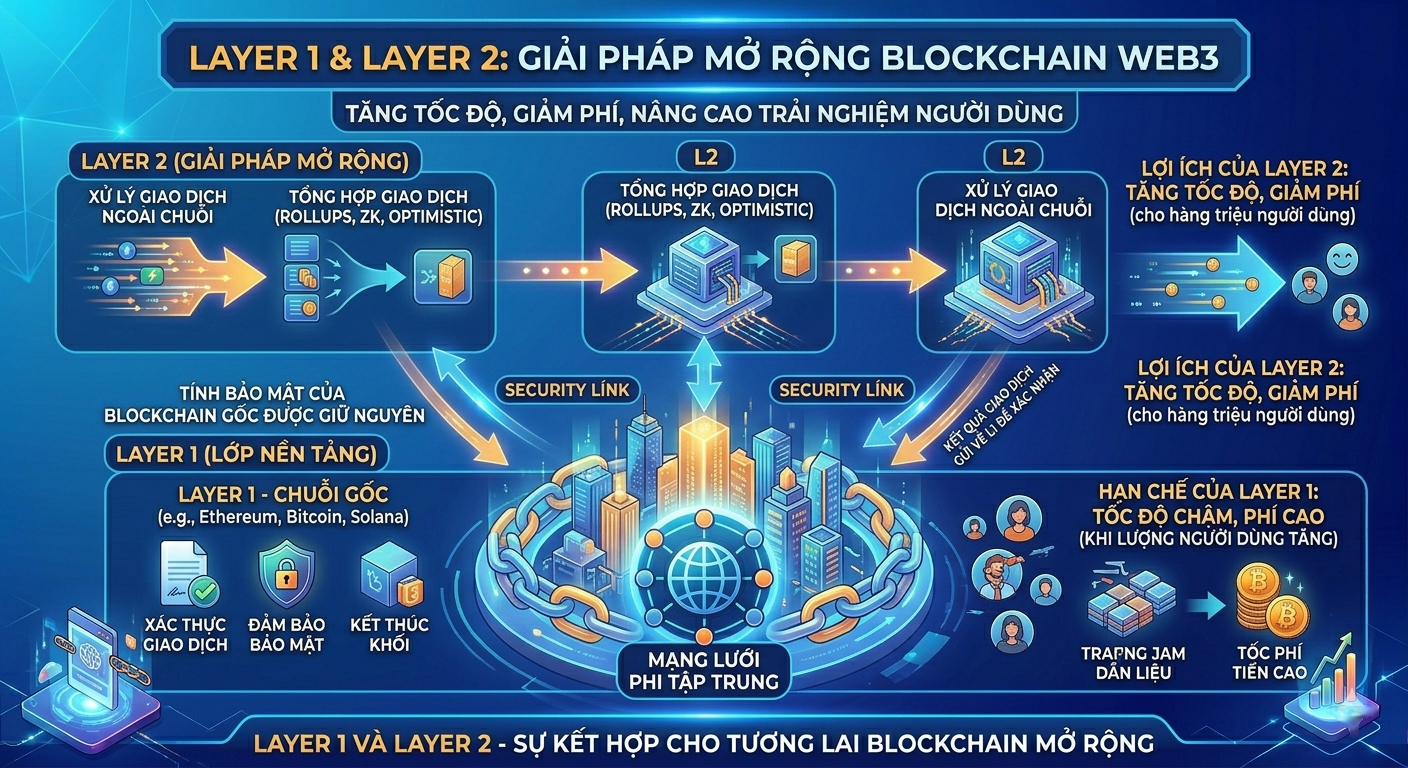 Layer 1 và Layer 2 là hai lớp hạ tầng quan trọng trong blockchain giúp mở rộng khả năng xử lý giao dịch và giảm phí trong hệ sinh thái Web3. Layer 1 là blockchain nền tảng như Ethereum, Bitcoin hay Solana, nơi xác thực giao dịch và đảm bảo bảo mật mạng lưới. Tuy nhiên, Layer 1 thường gặp vấn đề về tốc độ chậm và phí giao dịch cao khi lượng người dùng tăng.