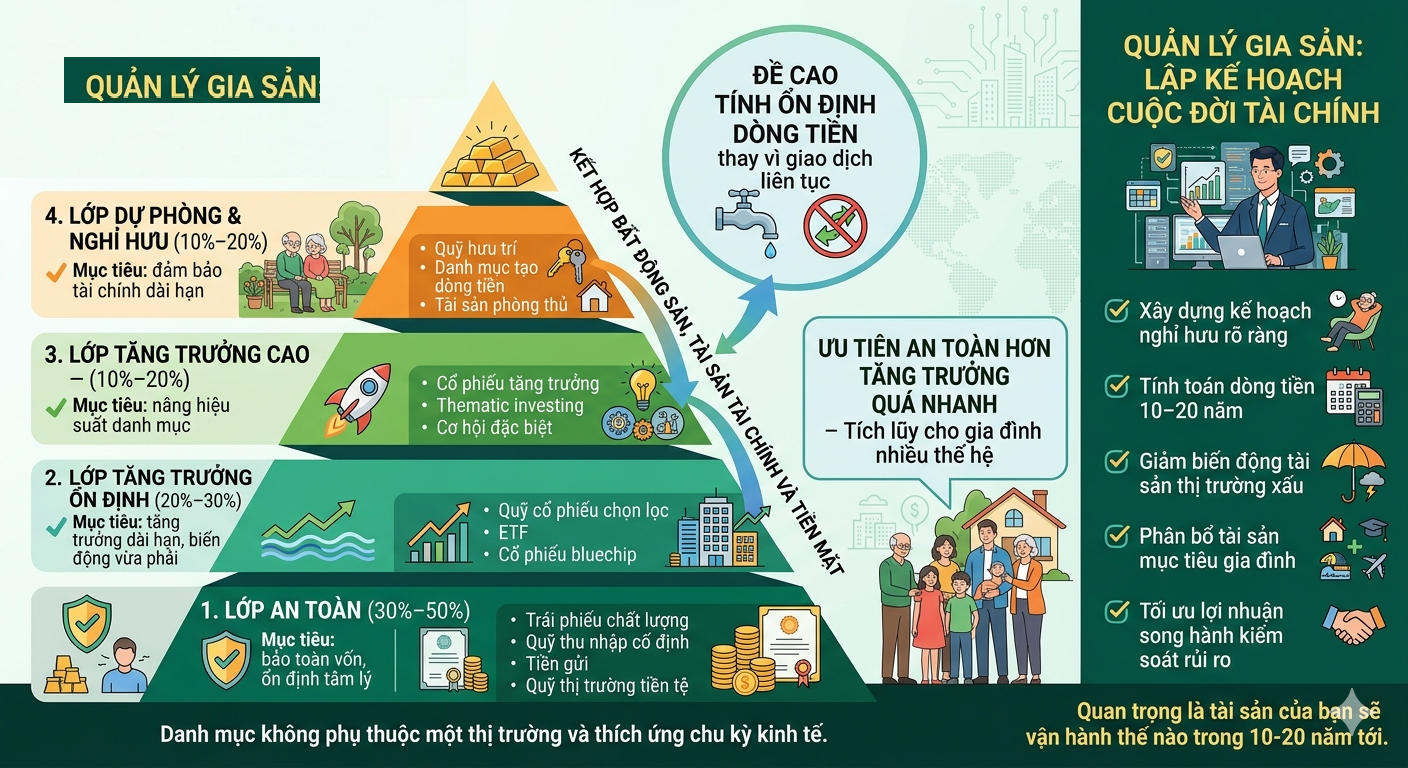 Quản lý gia sản không chỉ là đầu tư sinh lời, mà là thiết kế một hệ thống tài chính bền vững: phân bổ tài sản hợp lý, kiểm soát rủi ro, xây dựng quỹ nghỉ hưu và đảm bảo dòng tiền ổn định cho tương lai. Khi tài sản đủ lớn, điều quan trọng nhất không phải kiếm thêm bao nhiêu, mà là giữ vững nền tảng an toàn tài chính cho gia đình.