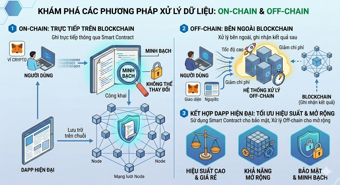 On-chain và Off-chain là hai cách xử lý dữ liệu trong blockchain. On-chain ghi giao dịch trực tiếp lên blockchain thông qua smart contract, đảm bảo minh bạch và không thể thay đổi. Off-chain xử lý dữ liệu bên ngoài blockchain để tăng tốc độ và giảm chi phí. Các dApp hiện đại thường kết hợp cả hai để tối ưu hiệu suất, bảo mật và khả năng mở rộng
