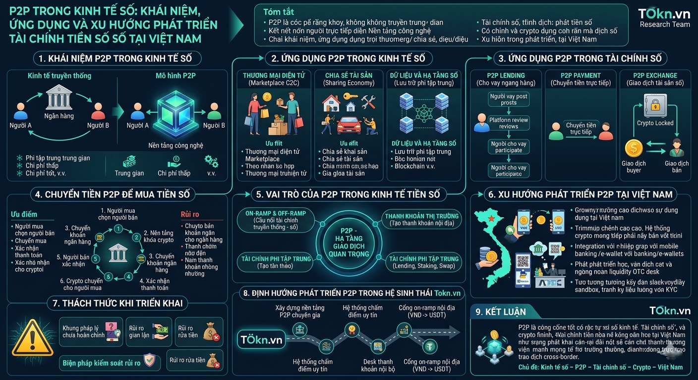 Trong bối cảnh kinh tế số phát triển nhanh, mô hình Peer-to-Peer (P2P) đang trở thành hạ tầng quan trọng kết nối trực tiếp người dùng trong các giao dịch tài chính và tài sản số. Từ cho vay ngang hàng, thanh toán số đến giao dịch tiền mã hóa, P2P giúp giảm vai trò trung gian, tối ưu chi phí và tăng tốc độ lưu chuyển vốn. Đặc biệt, trong thị trường crypto, P2P đóng vai trò cầu nối giữa tiền pháp định và tài sản số thông qua cơ chế chuyển tiền trực tiếp giữa người dùng. Tại Việt Nam, sự phổ biến của ngân hàng số, thanh toán điện tử và nhu cầu tiếp cận tài sản số đang thúc đẩy mô hình P2P phát triển mạnh, trở thành nền tảng quan trọng của hệ sinh thái kinh tế tiền số trong giai đoạn mới
