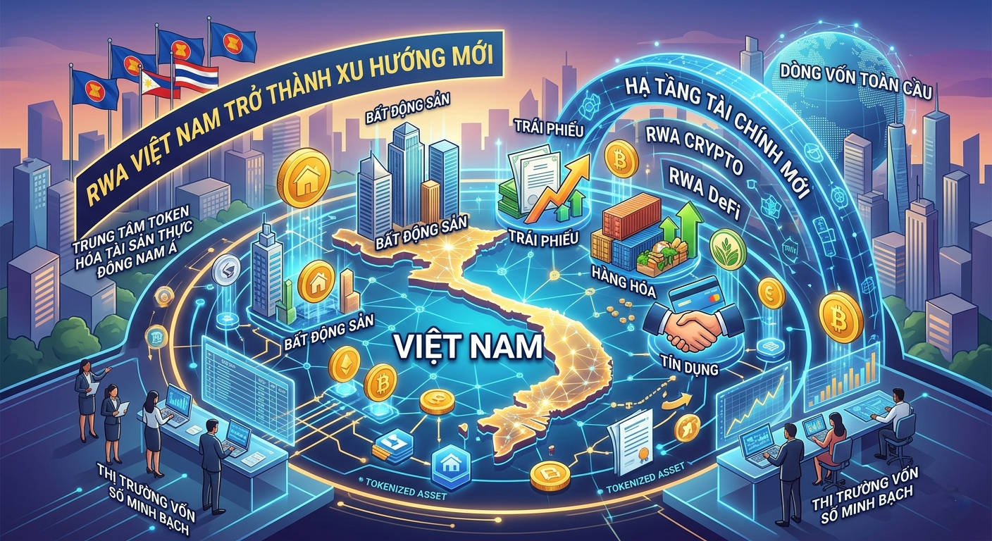 RWA Việt Nam đang trở thành xu hướng mới khi RWA (Real World Asset) đưa tài sản thực như bất động sản, trái phiếu, hàng hóa và tín dụng lên blockchain thông qua token hóa tài sản thực. Mô hình RWA blockchain giúp chia nhỏ tài sản, tăng thanh khoản và mở cửa dòng vốn toàn cầu cho RWA Việt Nam. Trong bối cảnh thị trường tài sản số phát triển, RWA crypto và RWA DeFi được xem là hạ tầng tài chính mới, nơi token hóa bất động sản, token hóa trái phiếu và token hóa hàng hóa có thể tạo ra thị trường vốn số minh bạch. Với lợi thế thị trường đang mở, RWA Việt Nam có tiềm năng trở thành trung tâm token hóa tài sản thực tại Đông Nam Á, dẫn dắt xu hướng RWA blockchain trong giai đoạn tới.