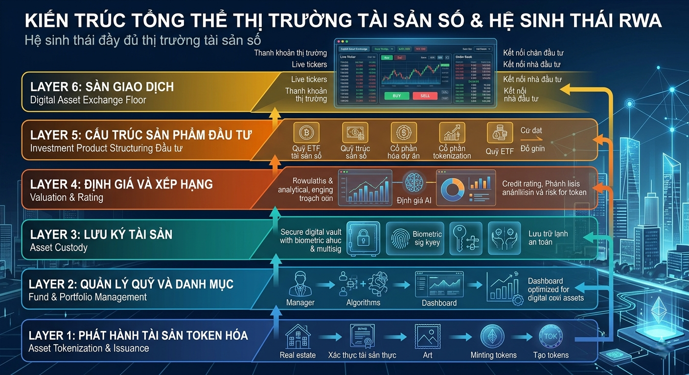 Thị trường tài sản mã hóa theo Nghị quyết 05 không chỉ là crypto trading. Đây là một thị trường vốn số hóa hoàn chỉnh, nơi tài sản thực được phát hành, lưu ký, giao dịch và đóng gói thành sản phẩm đầu tư.