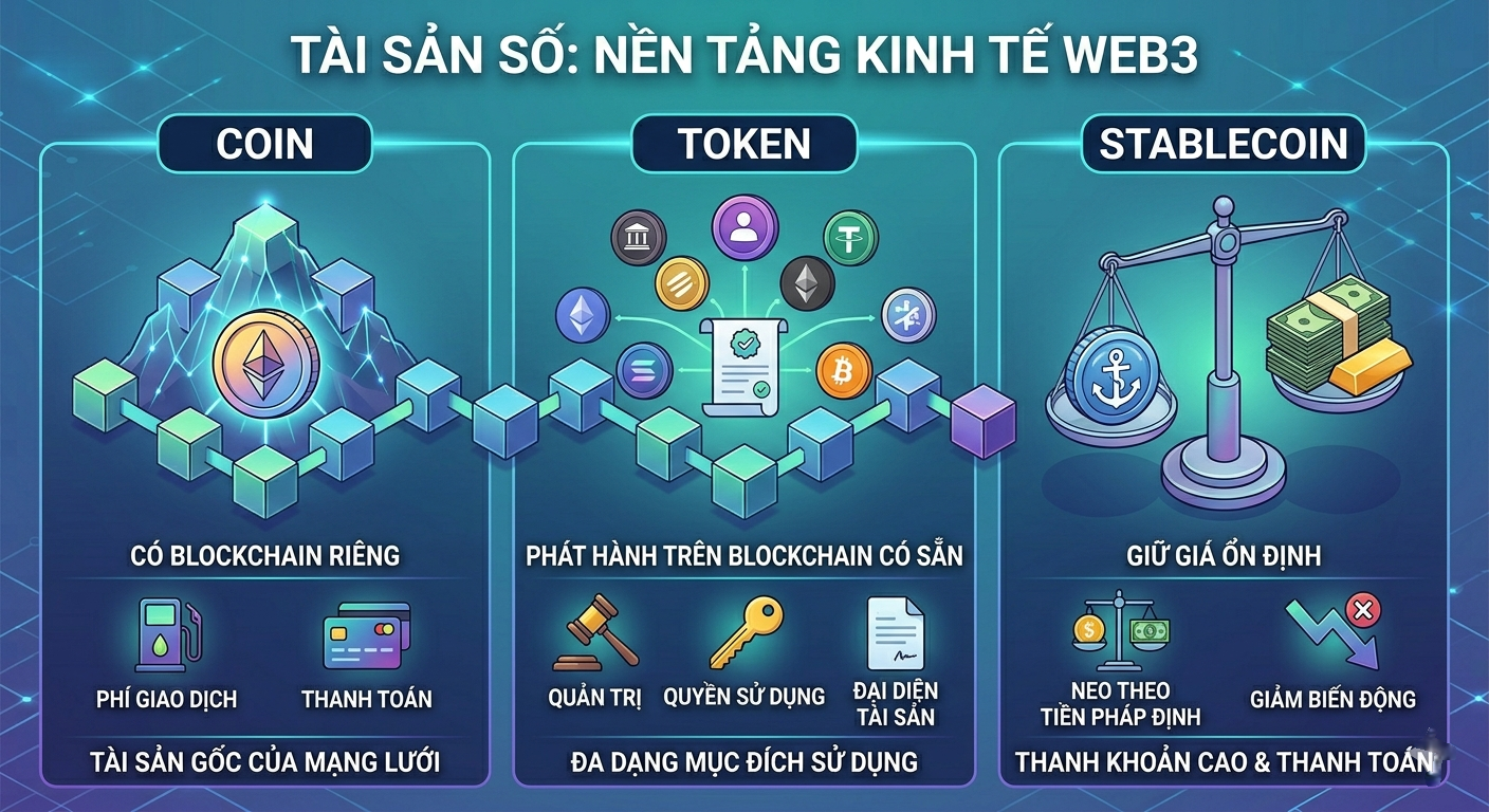 Tiền điện tử và tài sản số là nền tảng của nền kinh tế Web3, cho phép người dùng lưu trữ giá trị, giao dịch và tương tác với các ứng dụng phi tập trung. Trong hệ sinh thái blockchain, tài sản số được chia thành ba nhóm chính gồm coin, token và stablecoin. Mỗi loại có đặc điểm kỹ thuật, mục đích sử dụng và vai trò khác nhau trong mạng lưới.