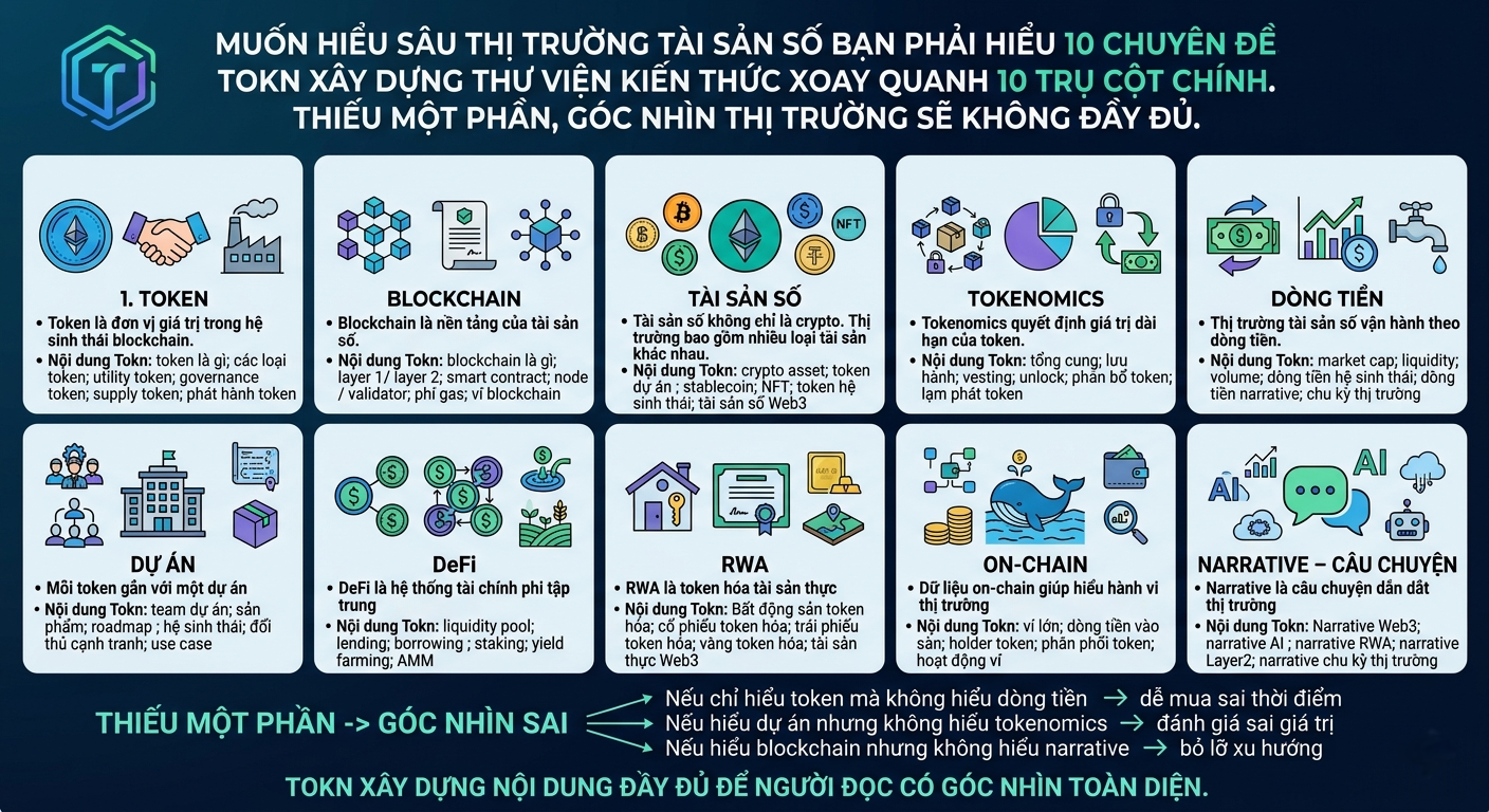 Tokn xây dựng thư viện kiến thức xoay quanh 10 trụ cột chính. Thiếu một phần, góc nhìn thị trường sẽ không đầy đủ.
