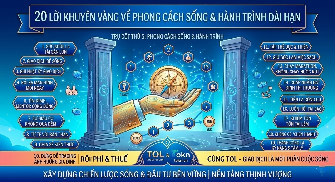 "10 NGUYÊN TẮC VÀNG – HÀNH TRANG SINH TỒN TRÊN THỊ TRƯỜNG TÀI CHÍNH"Trong hành trình đầu tư, kỹ thuật chỉ chiếm 20% thành công, 80% còn lại nằm ở tư duy và kỷ luật. TOL.vn (Trade Of Life) phối hợp cùng Tokn.vn giới thiệu bộ 10 Nguyên tắc vàng – những giá trị cốt lõi giúp biến việc giao dịch trở thành một phần tất yếu và cân bằng của cuộc sống.Chúng tôi hiểu rằng thị trường luôn biến động, nhưng những nguyên tắc này là "mỏ neo" vững chắc giúp bạn:Bảo vệ tài sản: Luôn đặt việc bảo toàn vốn lên hàng đầu với quy tắc 2% và dừng lỗ tuyệt đối.Làm chủ tâm lý: Xóa bỏ nỗi sợ FOMO, không tranh cãi với thị trường và biết cách "ngồi yên" khi cần thiết.Chiến lược thông minh: Không bao giờ "tất tay", thay vào đó là giải ngân từng bước để tối ưu hóa vị thế.Dù bạn đang giao dịch Chứng khoán truyền thống hay khám phá tiềm năng của Tài sản số (RWA), 10 nguyên tắc này chính là chìa khóa để bạn đạt được sự tĩnh lặng trong tâm trí và thịnh vượng về tài chính.