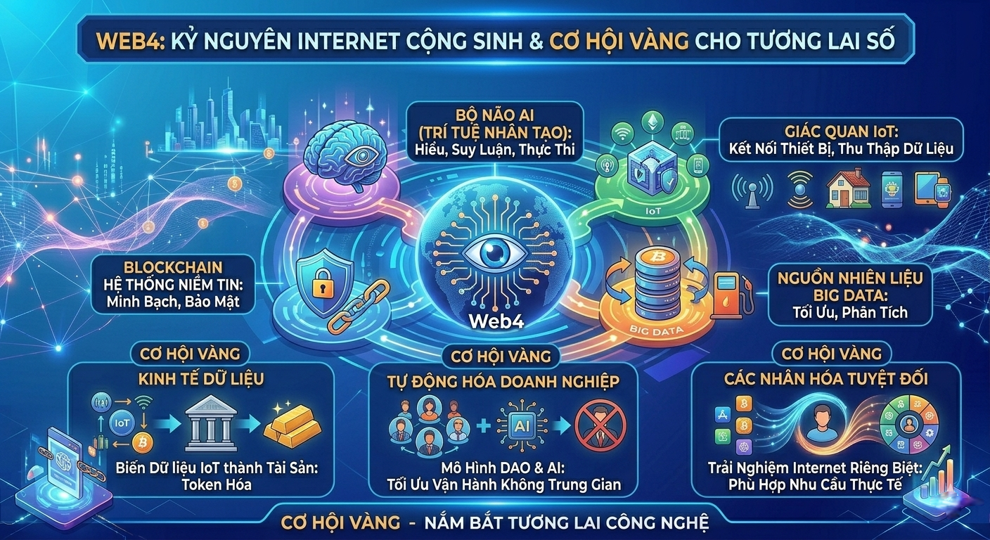 Web4 được định nghĩa là "Internet cộng sinh", nơi Trí tuệ nhân tạo (AI) đóng vai trò bộ não, Blockchain là hệ thống niềm tin, IoT là giác quan và Big Data là nguồn nhiên liệu. Sự kết hợp này cho phép internet hiểu, suy luận và thực thi các tác vụ phức tạp một cách tự động và minh bạch.