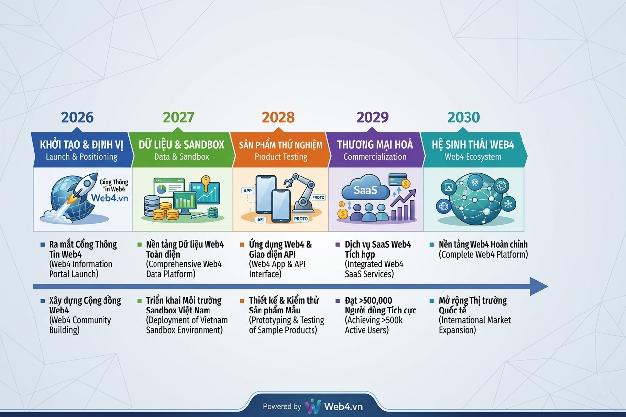 Giai đoạn 2027 (Dữ liệu & Sandbox): Bước vào mảng phân tích dữ liệu chuyên sâu với các Dashboard theo dõi thị trường. Đây là giai đoạn quan trọng khi Web4.vn dự kiến tham gia vào Sandbox tài sản số tại Việt Nam, tạo môi trường thử nghiệm pháp lý và công nghệ.