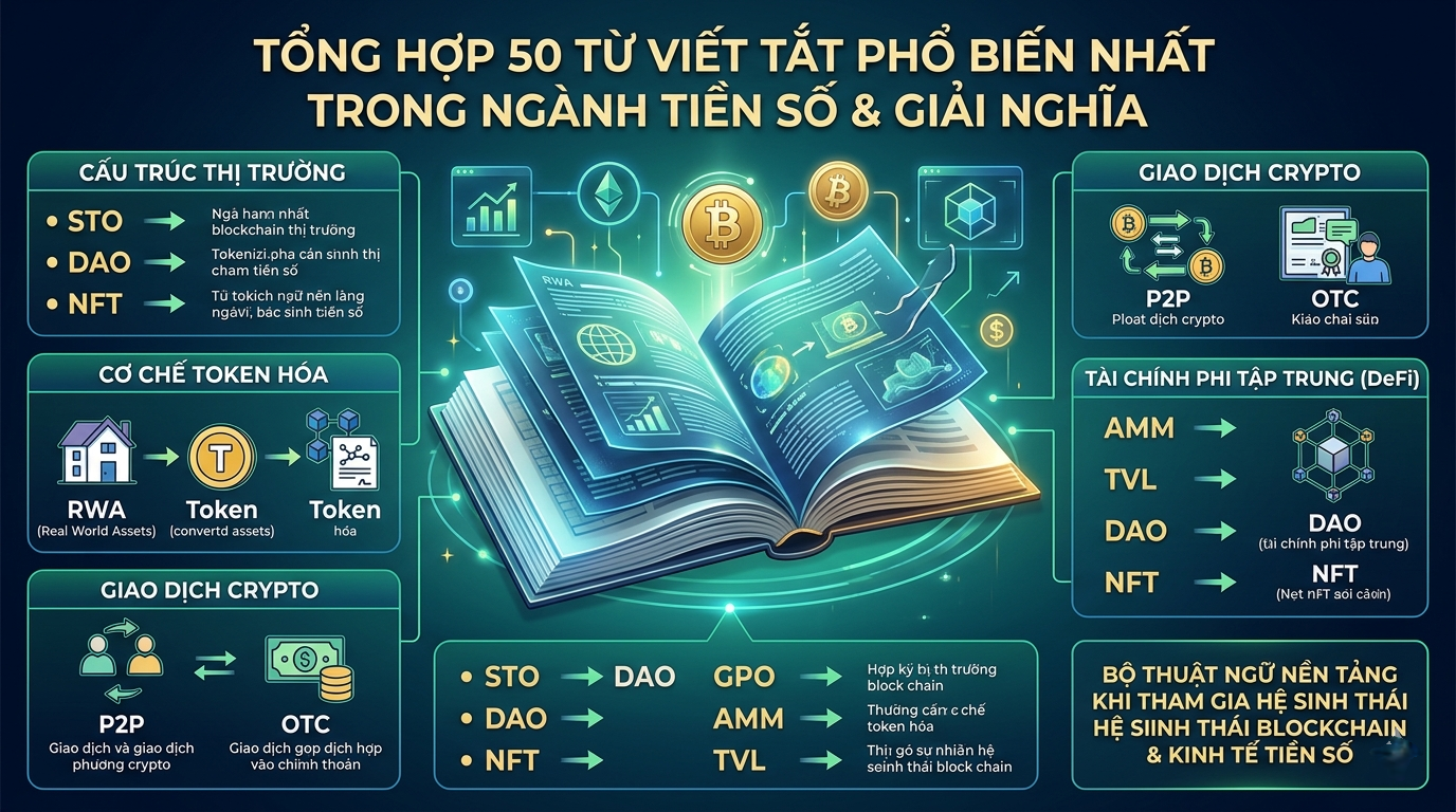Thị trường tài sản số phát triển nhanh kéo theo hàng loạt thuật ngữ viết tắt như STO, RWA, DeFi, DAO hay TVL được sử dụng phổ biến trong giao dịch và phân tích. Việc hiểu đúng các khái niệm này giúp nhà đầu tư nắm bắt cấu trúc thị trường, cơ chế vận hành và đánh giá dự án hiệu quả hơn. Danh sách dưới đây tổng hợp 50 từ viết tắt quan trọng nhất trong ngành tiền số, bao gồm nhóm tài chính phi tập trung, giao dịch thị trường, token hóa tài sản thực và hạ tầng blockchain