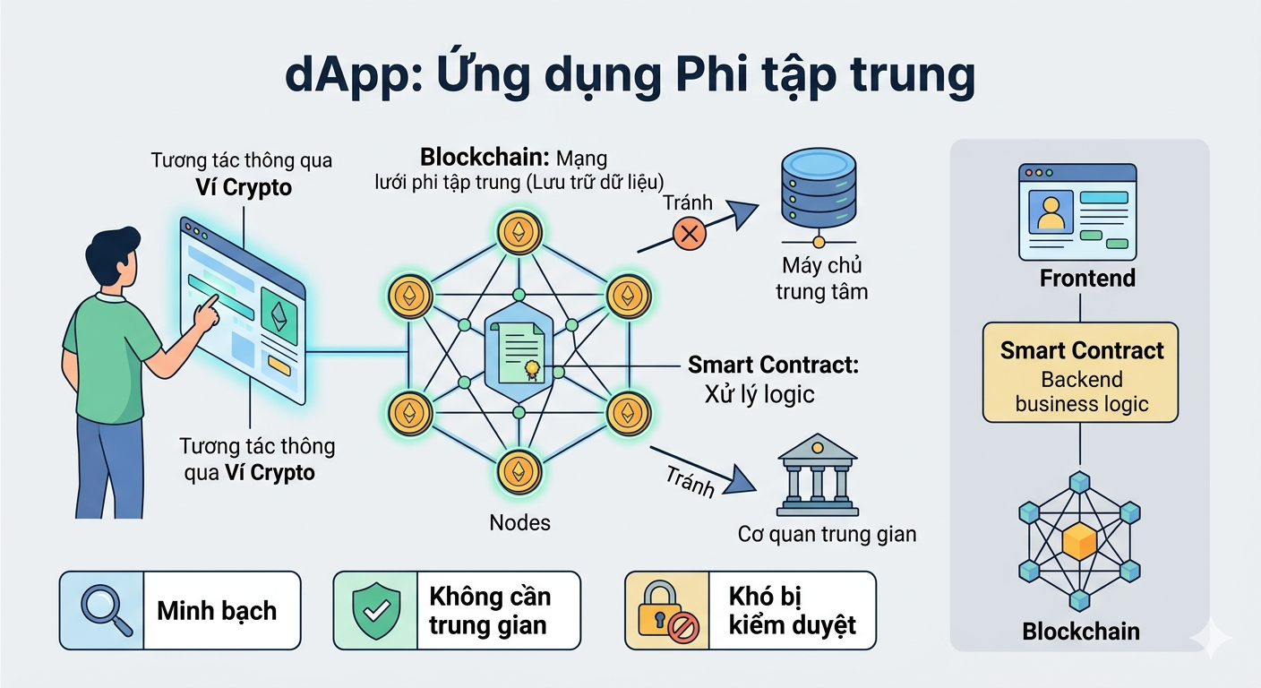 dApp (Decentralized Application) là ứng dụng phi tập trung hoạt động trên blockchain thay vì máy chủ trung tâm. Khác với ứng dụng truyền thống, dApp sử dụng smart contract để xử lý logic, lưu trữ dữ liệu trên mạng lưới node và cho phép người dùng tương tác thông qua ví crypto. Điều này giúp dApp minh bạch, không cần trung gian và khó bị kiểm duyệt.