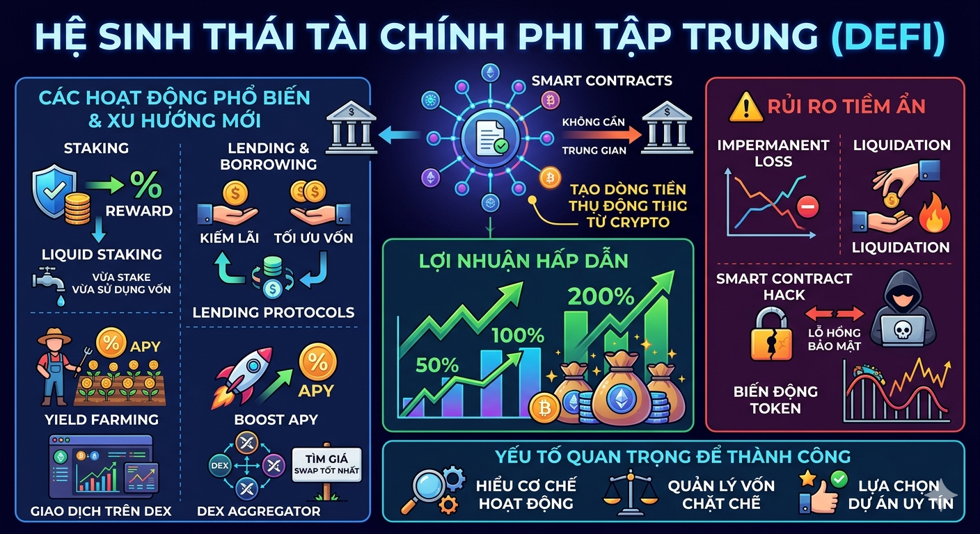DeFi (Decentralized Finance) đang mở ra hệ thống tài chính phi tập trung nơi nhà đầu tư có thể staking, lending, yield farming và giao dịch trên DEX mà không cần trung gian. Thay vì gửi tiền vào ngân hàng, người dùng tận dụng smart contract để tạo dòng tiền thụ động từ crypto.