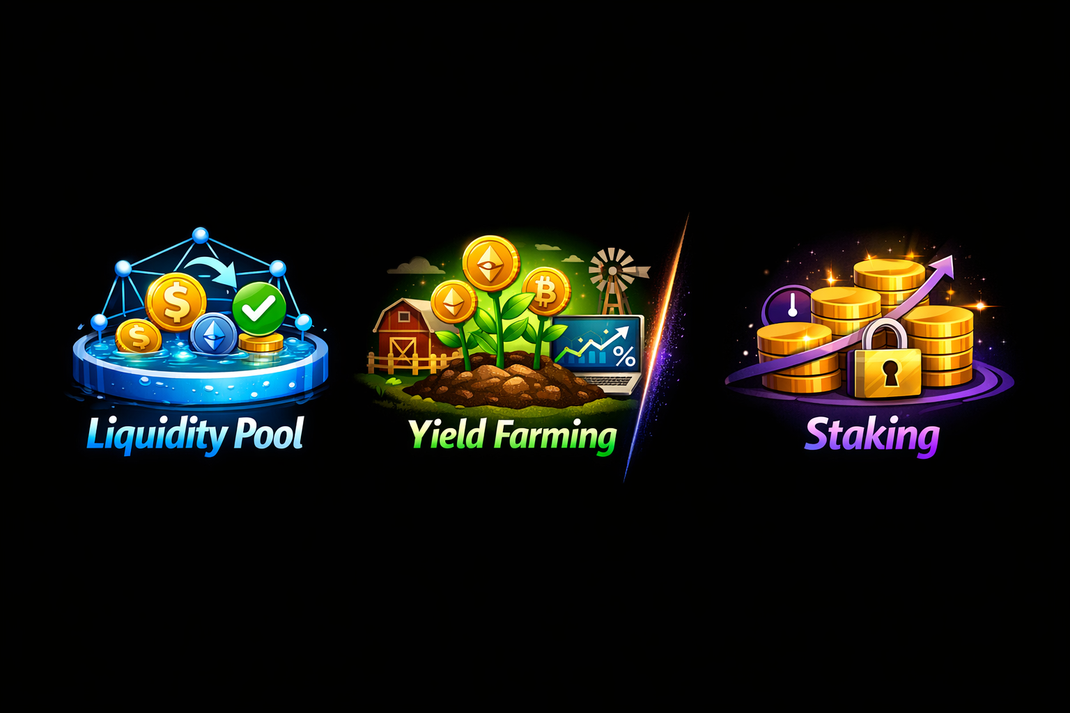 So sánh Liquidity Pool vs Yield Farming vs Staking