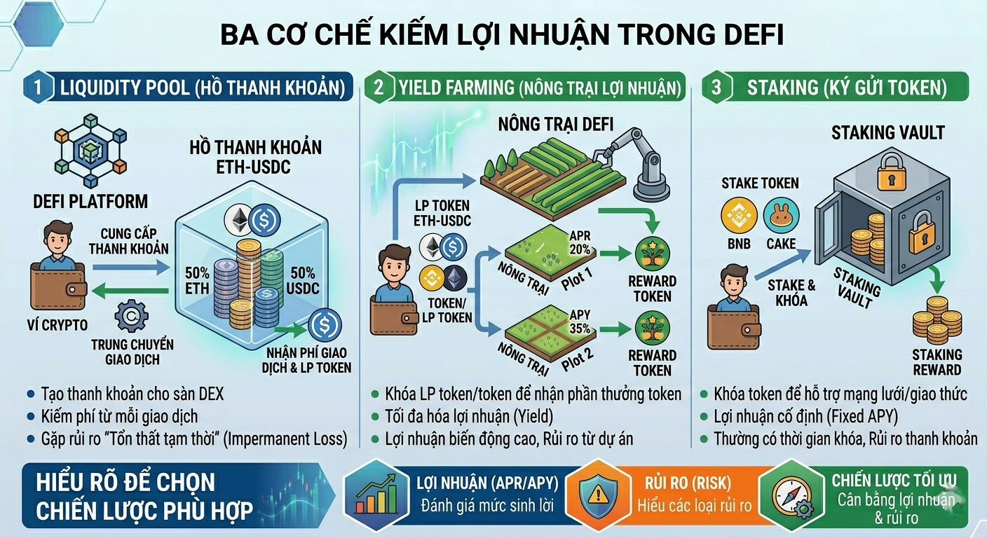 Liquidity Pool, Yield Farming và Staking là ba cơ chế kiếm lợi nhuận phổ biến trong DeFi. Người dùng có thể cung cấp thanh khoản, khóa token hoặc stake LP token để nhận phí giao dịch và phần thưởng. Hiểu rõ cách hoạt động của từng hình thức giúp đánh giá lợi nhuận, rủi ro và lựa chọn chiến lược phù hợp khi tham gia hệ sinh thái crypto.