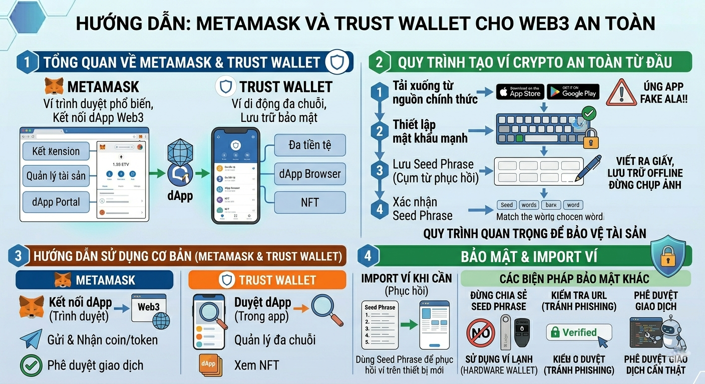 MetaMask và Trust Wallet là hai ví crypto phổ biến giúp người dùng lưu trữ tài sản và kết nối với dApp trong Web3. Để sử dụng an toàn, người mới cần biết cách tạo ví, lưu seed phrase, bảo mật tài khoản và import ví khi cần. Bài viết này hướng dẫn cách dùng MetaMask, Trust Wallet và quy trình tạo ví crypto an toàn từ đầu.
