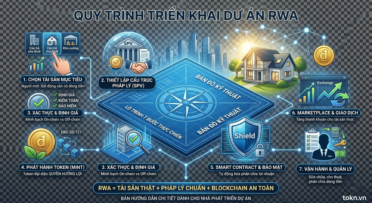Trong làn sóng tài chính phi tập trung, RWA (Real-World Assets) đang nổi lên như một "chiếc cầu nối" vững chắc nhất đưa dòng vốn khổng lồ từ thế giới thực vào mạng lưới Blockchain. Tuy nhiên, sự khác biệt giữa một dự án RWA thành công và một dự án "chết yểu" không nằm ở công nghệ, mà nằm ở quy trình triển khai.