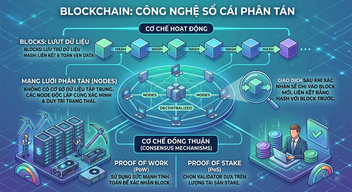Nguyên lý hoạt động của blockchain dựa trên sự kết hợp giữa block lưu trữ dữ liệu, hash đảm bảo tính toàn vẹn, node xác minh giao dịch và cơ chế đồng thuận giúp toàn mạng thống nhất trạng thái. Hai cơ chế consensus phổ biến nhất hiện nay là Proof of Work (PoW) và Proof of Stake (PoS). PoW sử dụng sức mạnh tính toán để xác nhận block, trong khi PoS chọn validator dựa trên lượng tài sản stake