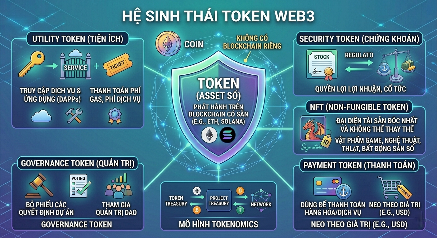 Token là tài sản số được phát hành trên blockchain có sẵn và đại diện cho nhiều loại giá trị khác nhau như quyền sử dụng, quyền quản trị, tài sản tài chính hoặc vật phẩm kỹ thuật số. Trong hệ sinh thái Web3, token được chia thành nhiều loại dựa trên chức năng và mục đích sử dụng. Các loại phổ biến gồm utility token, governance token, security token, payment token và NFT.