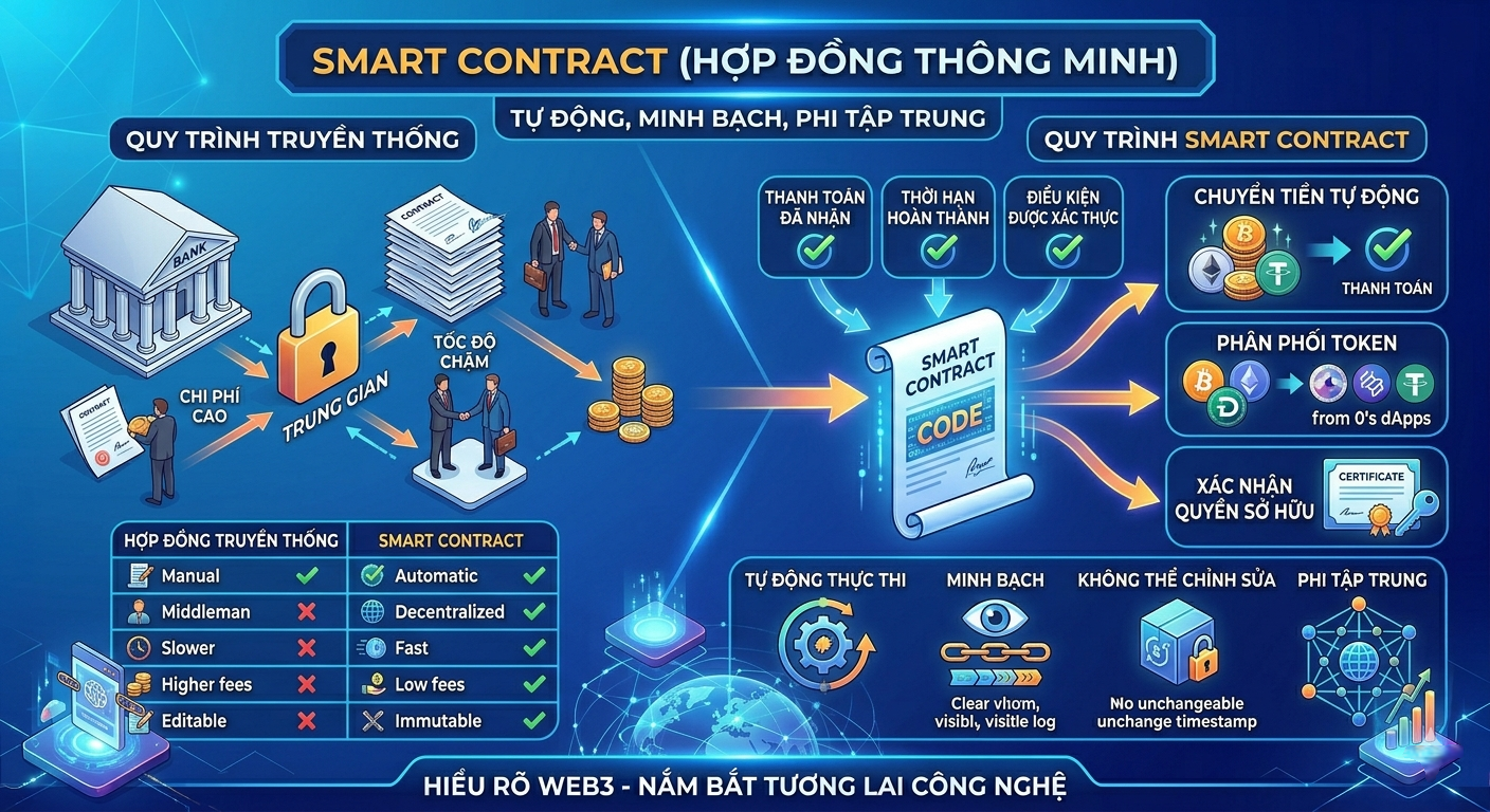 Smart contract là chương trình tự động chạy trên blockchain, giúp thực thi giao dịch mà không cần trung gian. Công nghệ này cho phép xây dựng DeFi, NFT, DAO và token hóa tài sản, đồng thời tạo ra nền kinh tế Web3 minh bạch, tự động và phi tập trung.